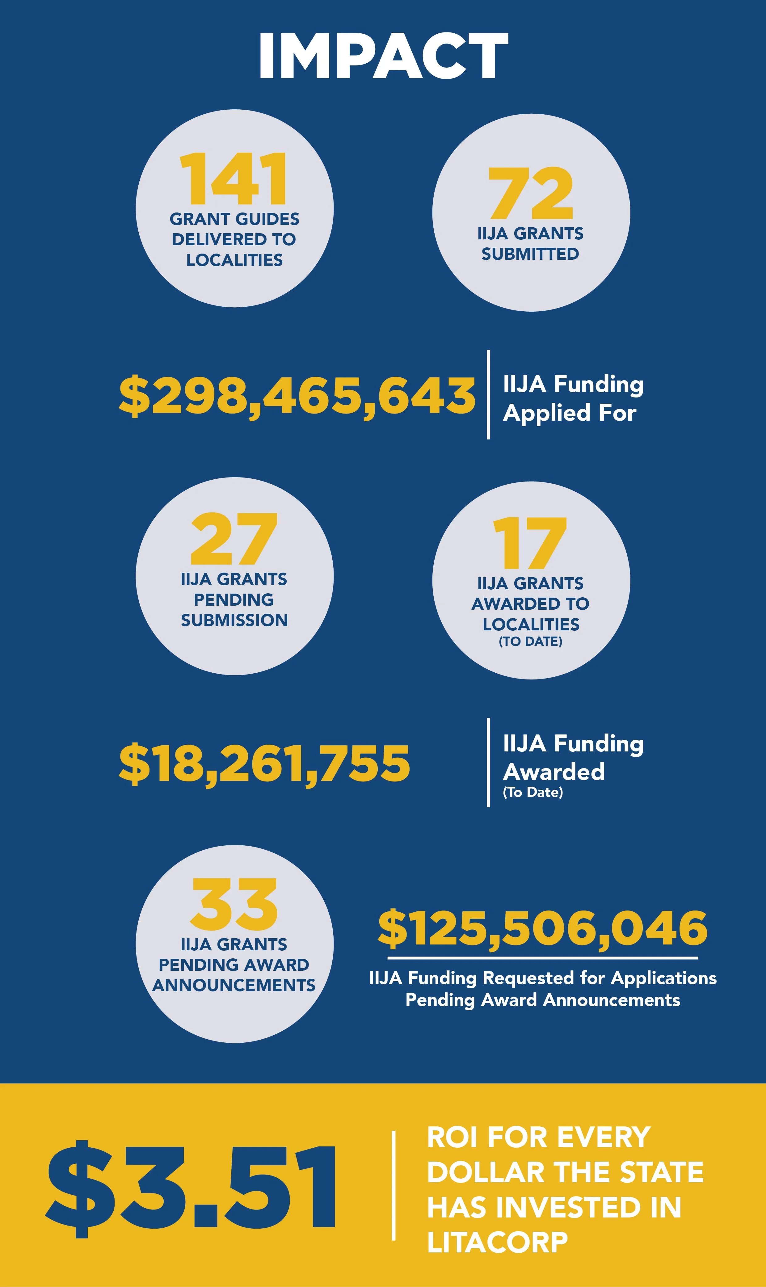 LITACorp assists localities in identifying and writing grant applications for funding available under IIJA/BIL. Below is a snapshot of LITACorp’s progress as of December 9, 2025 since starting work in July 2023.