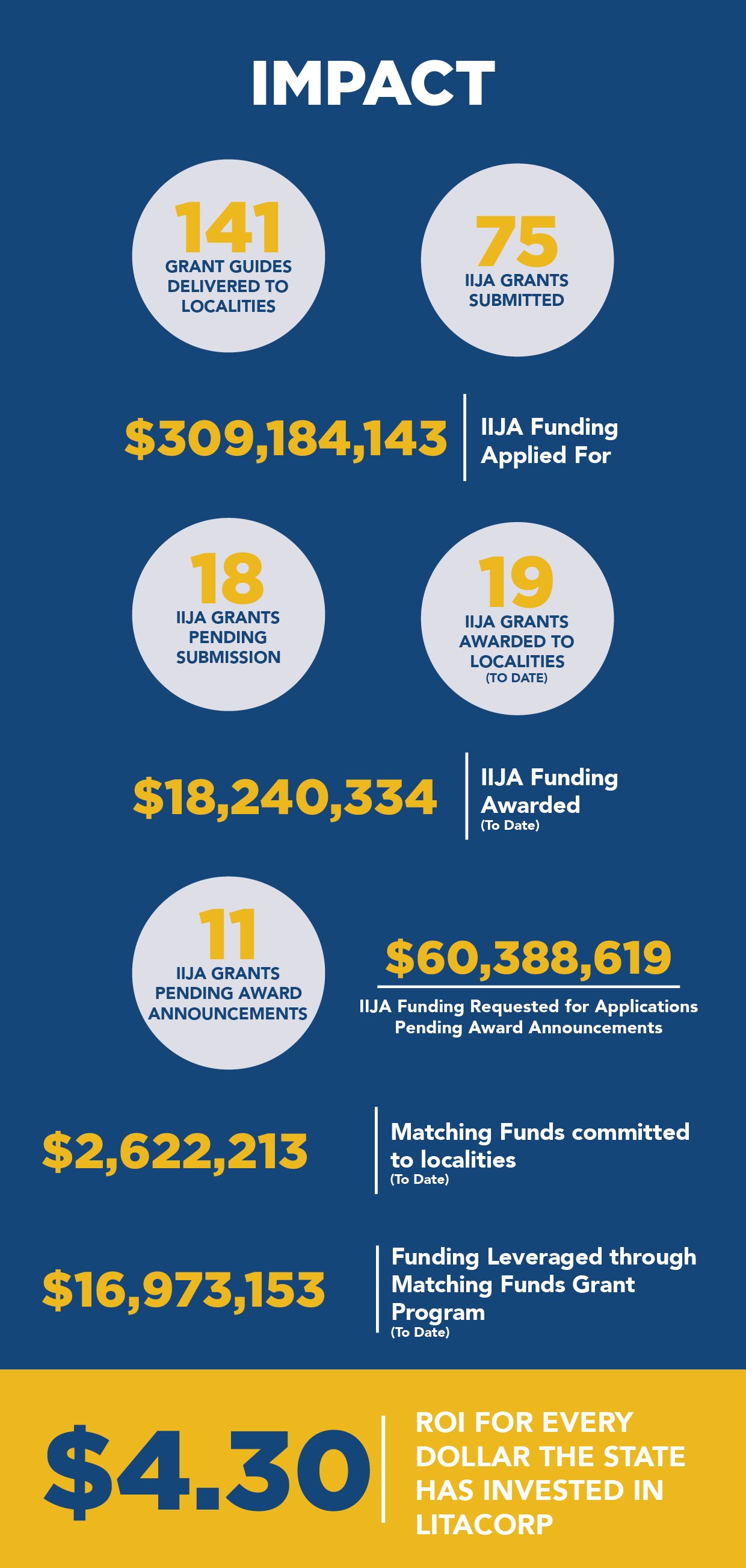 The Louisiana Infrastructure Technical Assistance Corporation (LITACorp) is a 501(c)(3) nonprofit organization with a mission to advance the economic prosperity of Louisiana communities. LITACorp is a collaborative partnership between the Louisiana Municipal Association and the Police Jury Association of Louisiana to assist local governments with accessing federal grants through the Infrastructure Investment and Jobs Act to construct, improve, and repair public infrastructure in rural and economically distressed communities.